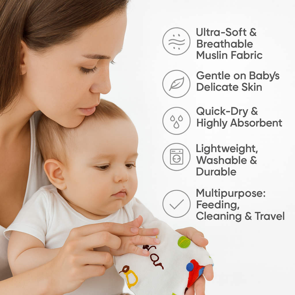 Ultra-soft and breathable, this 100% cotton muslin baby face towel (25×25 cm) is perfect for wiping your baby’s face, hands, and during feeding. Gentle on delicate skin, quick-drying, and ideal as a napkin or daily use washcloth. A must-have for every diaper bag.